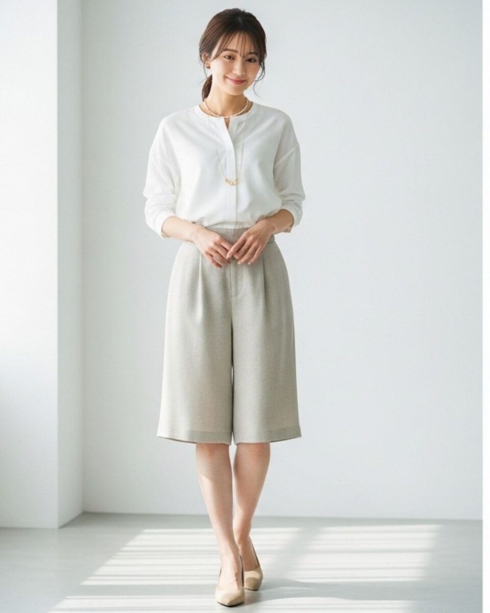 夏はとろみ素材やコットン素材のショートパンツが涼しさと上品さを両立できる選択肢です。