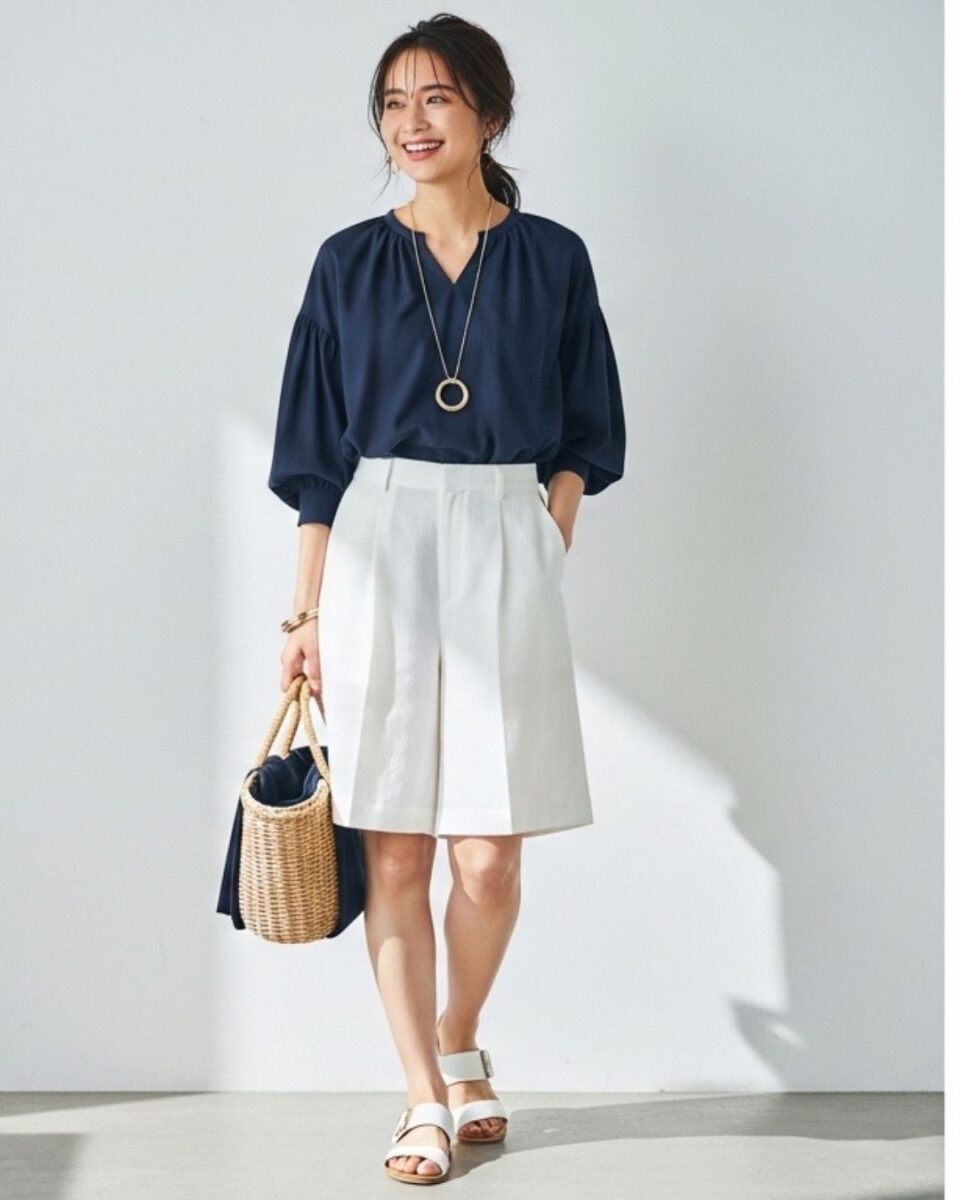 春は、明るいベージュやネイビーのリネン素材のショートパンツに、シアーブラウスや薄手のカーディガンを合わせると季節感のある爽やかなスタイルになります。