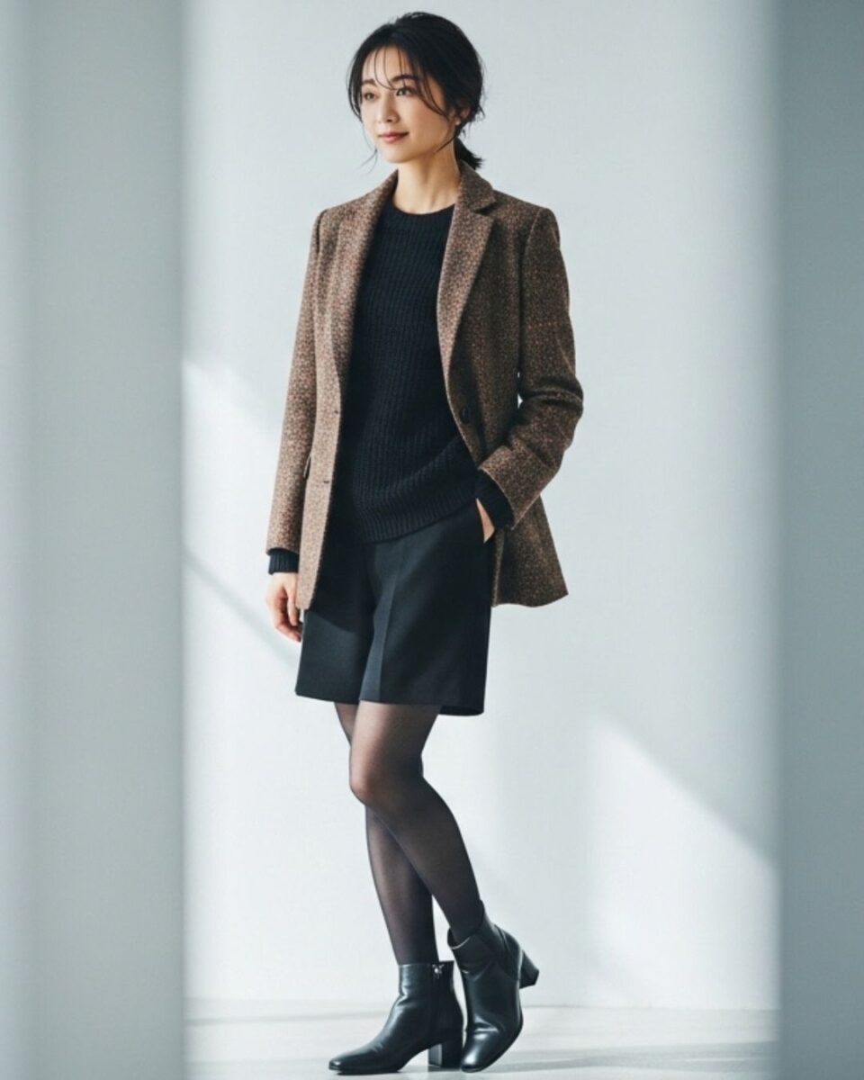 ウール素材のショートパンツにツイードジャケットを合わせると、季節感があって洗練された大人のコーデが完成します。