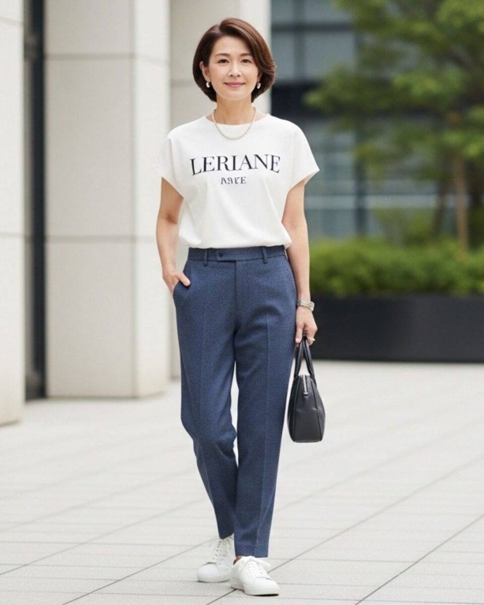 部屋着に見せない50代のロゴTシャツ着こなし術