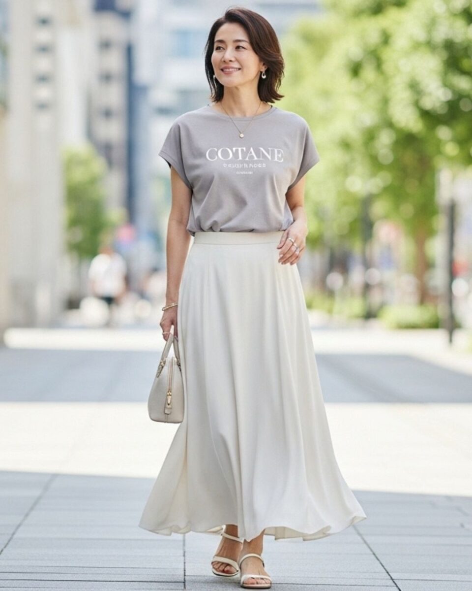 スカートはシフォンやサテン素材のものを選ぶと、Tシャツのカジュアルさが中和されて上品さが出ます。