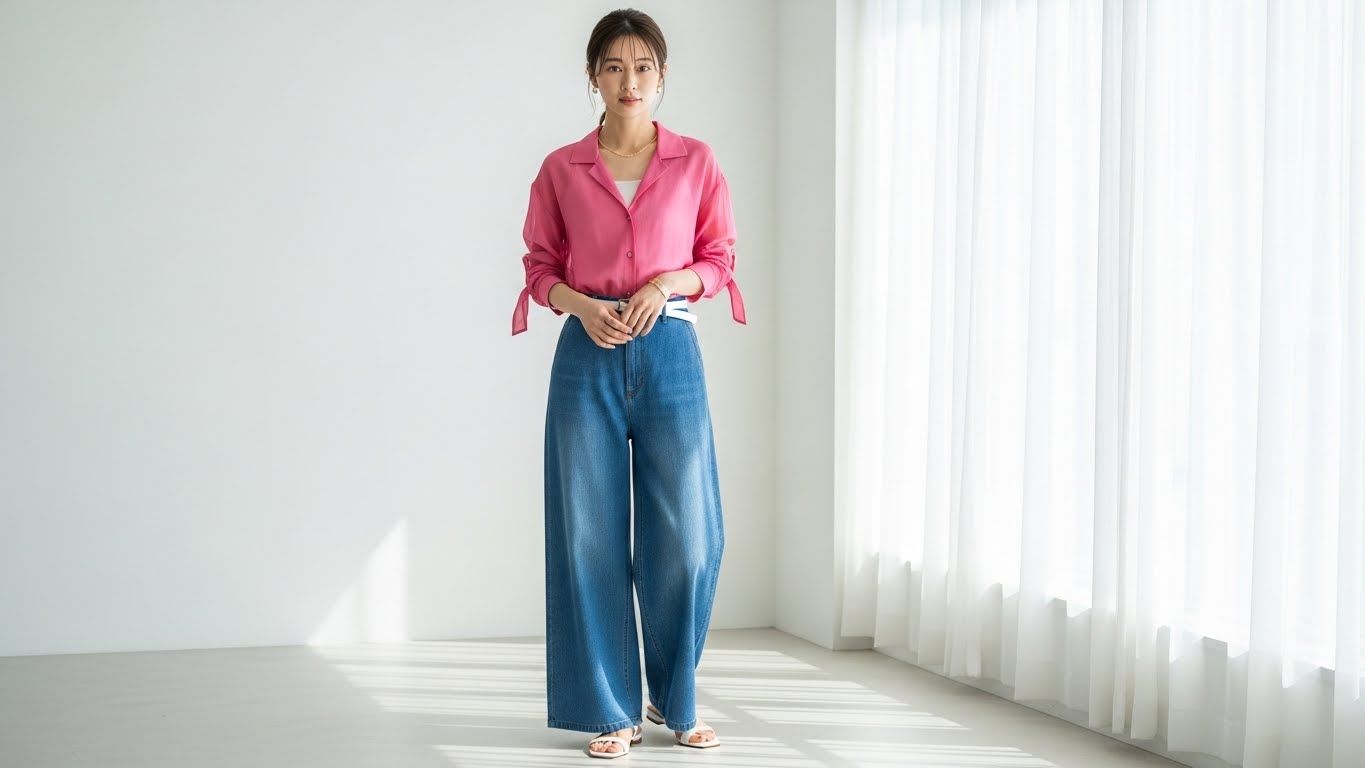 ピンクのワイドパンツやロングスカートなら、下半身に視線を誘導して全体のバランスが取りやすくなります。