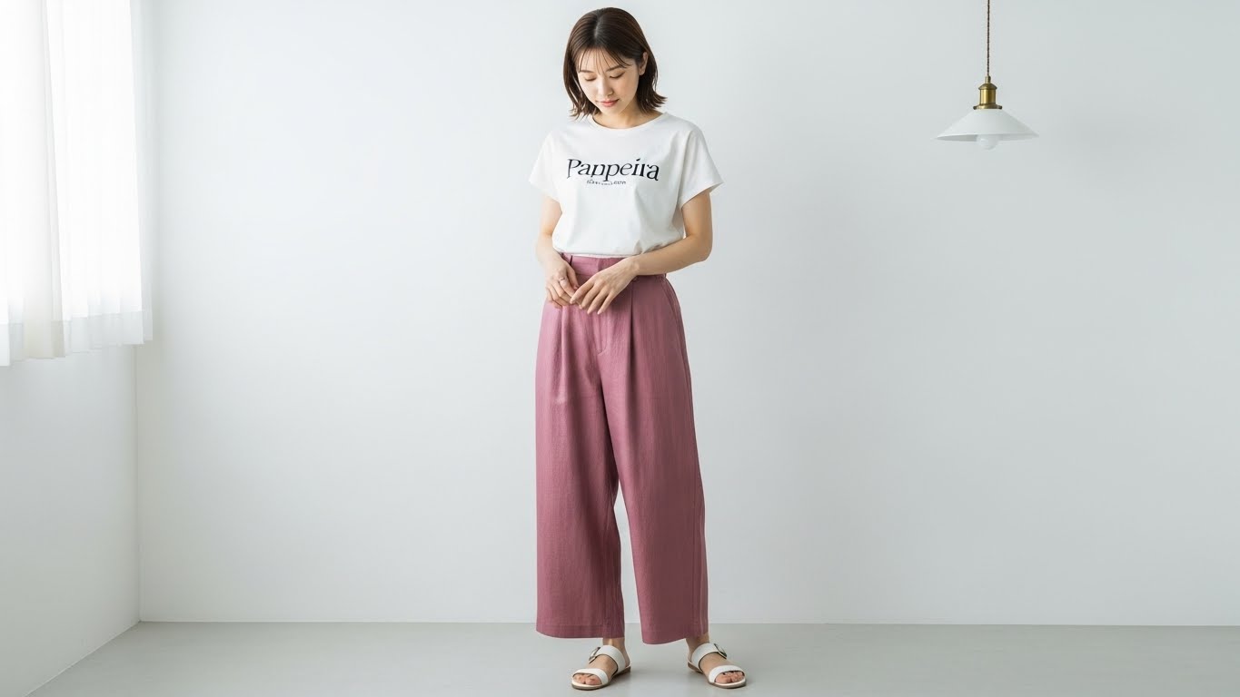 淡いピンクのリネンパンツなら、汗染みが目立ちにくく安心して楽しめます。