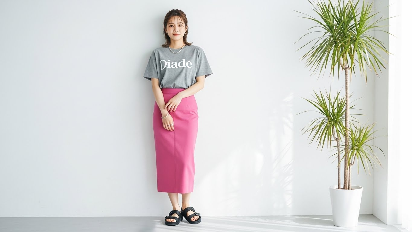 すっきりとしたシルエットのスカートなら、Tシャツのカジュアルさとのバランスが取れます。