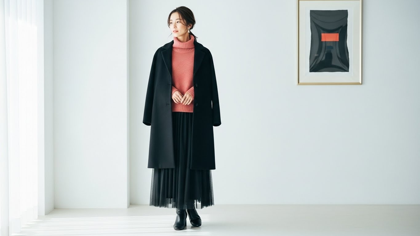 黒やベージュのコートから鮮やかなピンクニットを覗かせる着こなしは、顔色を明るく見せてくれます。