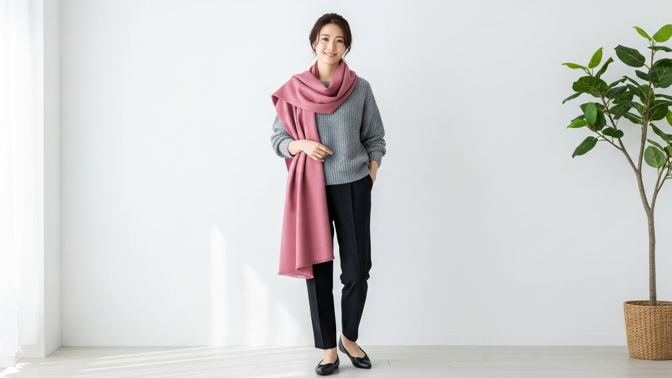 シンプルコーデを格上げする大判ピンクマフラーの差し色