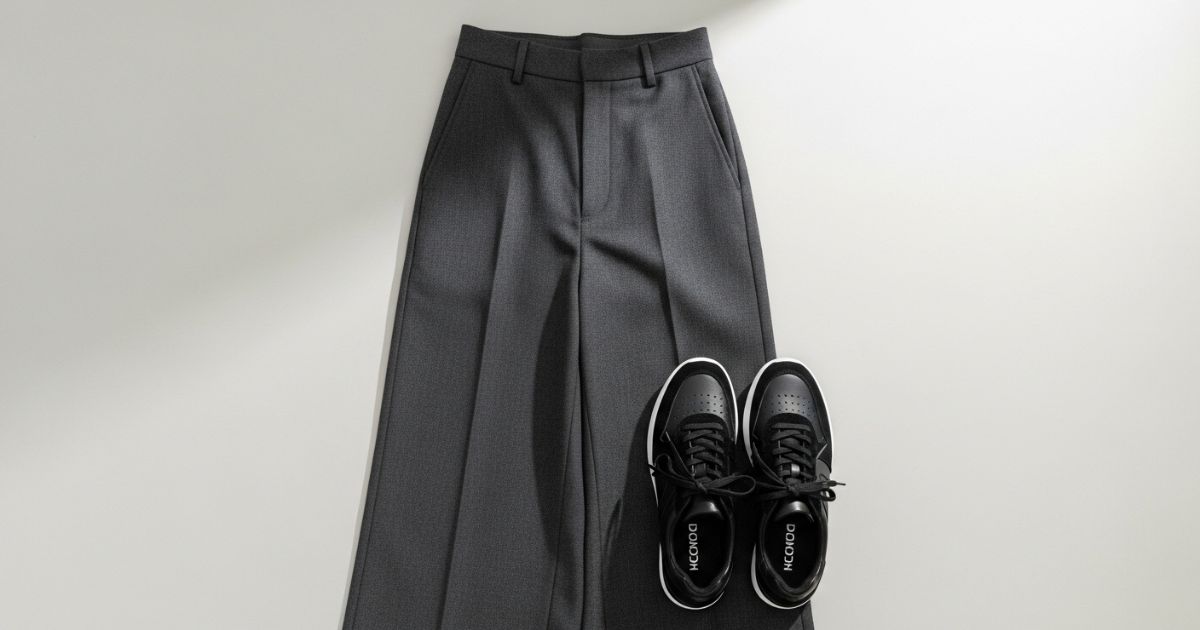 センタープレスが入ったスラックスや、落ち感のある素材のワイドパンツなど、上品さを感じるパンツを選ぶと、スニーカーのカジュアルさとちょうどよいバランスになります。