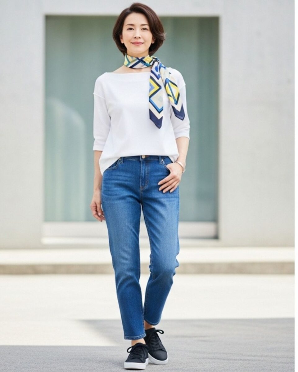 ストレートやテーパードなど、すっきりとしたシルエットのデニムを選ぶのも、40・50代らしさを保つコツです。