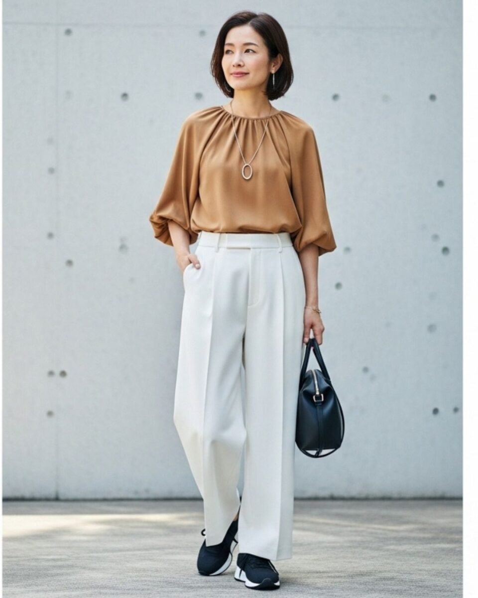ホワイト・ベージュ・パステルカラーなどの明るいトップスは、黒スニーカーとの対比もきれいで40・50代のスタイルにもよく似合います。