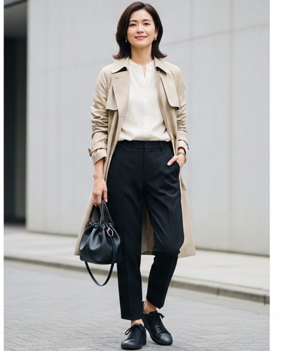 黒スニーカーとパンツのコーデを、より大人らしくおしゃれに仕上げるためには、いくつかの意識ポイントがあります。スニーカーを合わせてもきれいめに見えるのは、全体のバランスを意識しているから。ここでは、40・50代が特に意識したい3つのポイントを解説します。