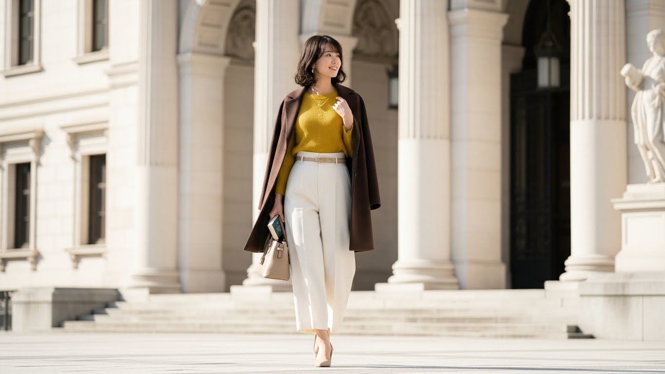 秋冬にはブラウンのコートにマスタードのニット、春夏にはブラウンのパンツに明るいイエローのブラウスを合わせてみましょう。
