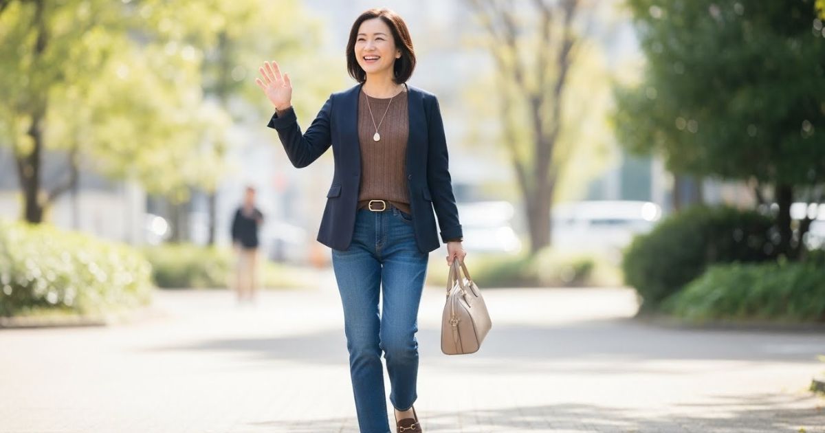 春夏はライトブルーのカーディガンやシャツ、秋冬はデニムパンツにブラウンのニットやコートを合わせるのがおすすめ。