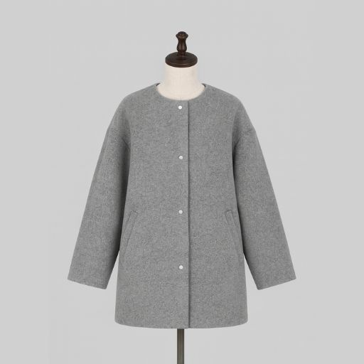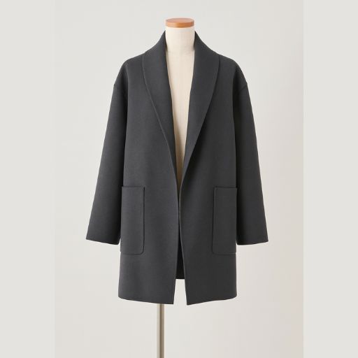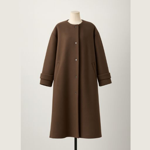 襟のないすっきりとしたデザインが特徴のノーカラーコート。