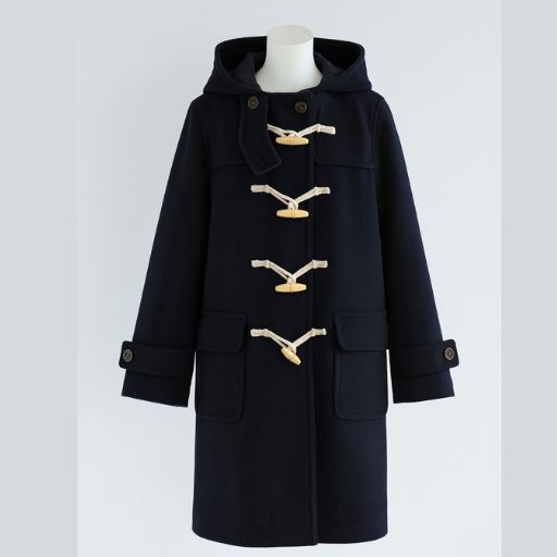 フード付きでトグルボタン(木製や角製の留め具)が特徴的なダッフルコート。