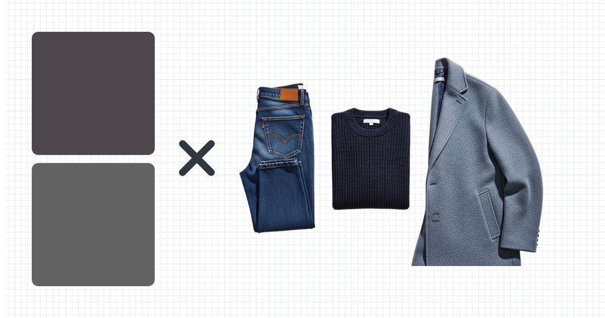 特にネイビーと黒は色の差が出にくいため、あえてロイヤルブルーや明るめの青を選ぶと、メリハリのあるコーデに仕上がります。