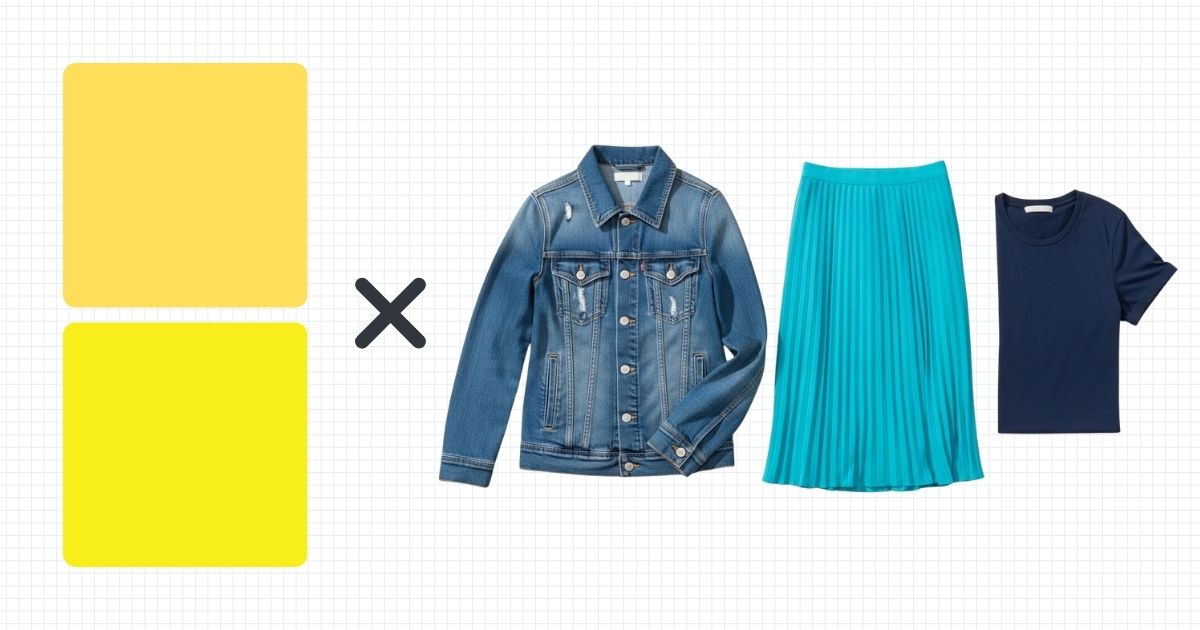 青×イエローは補色に近い関係で、お互いを引き立て合います。