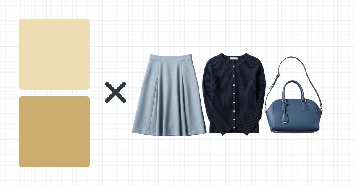 女性らしく上品な雰囲気になり、特にくすんだ青やネイビーとの相性が抜群。