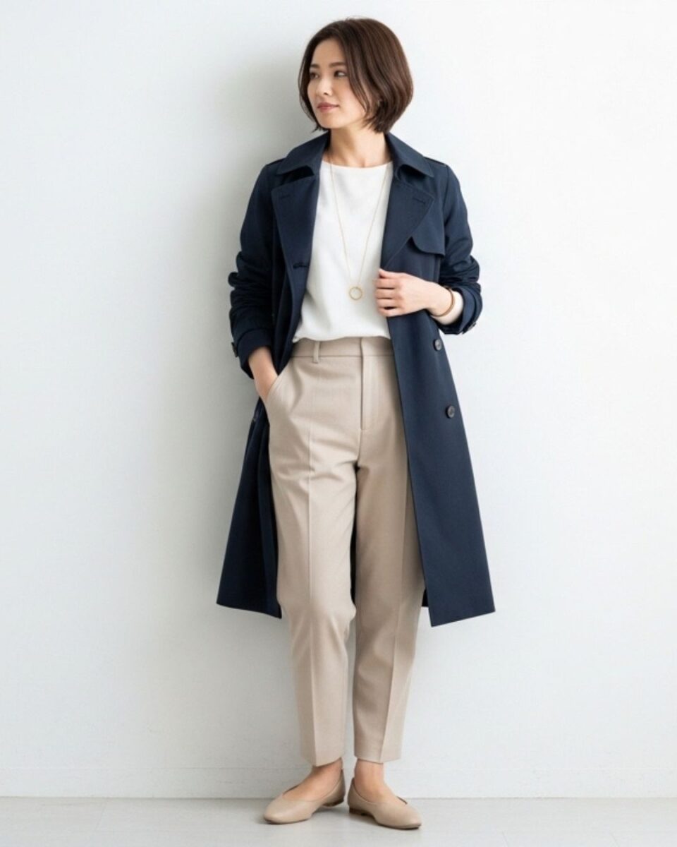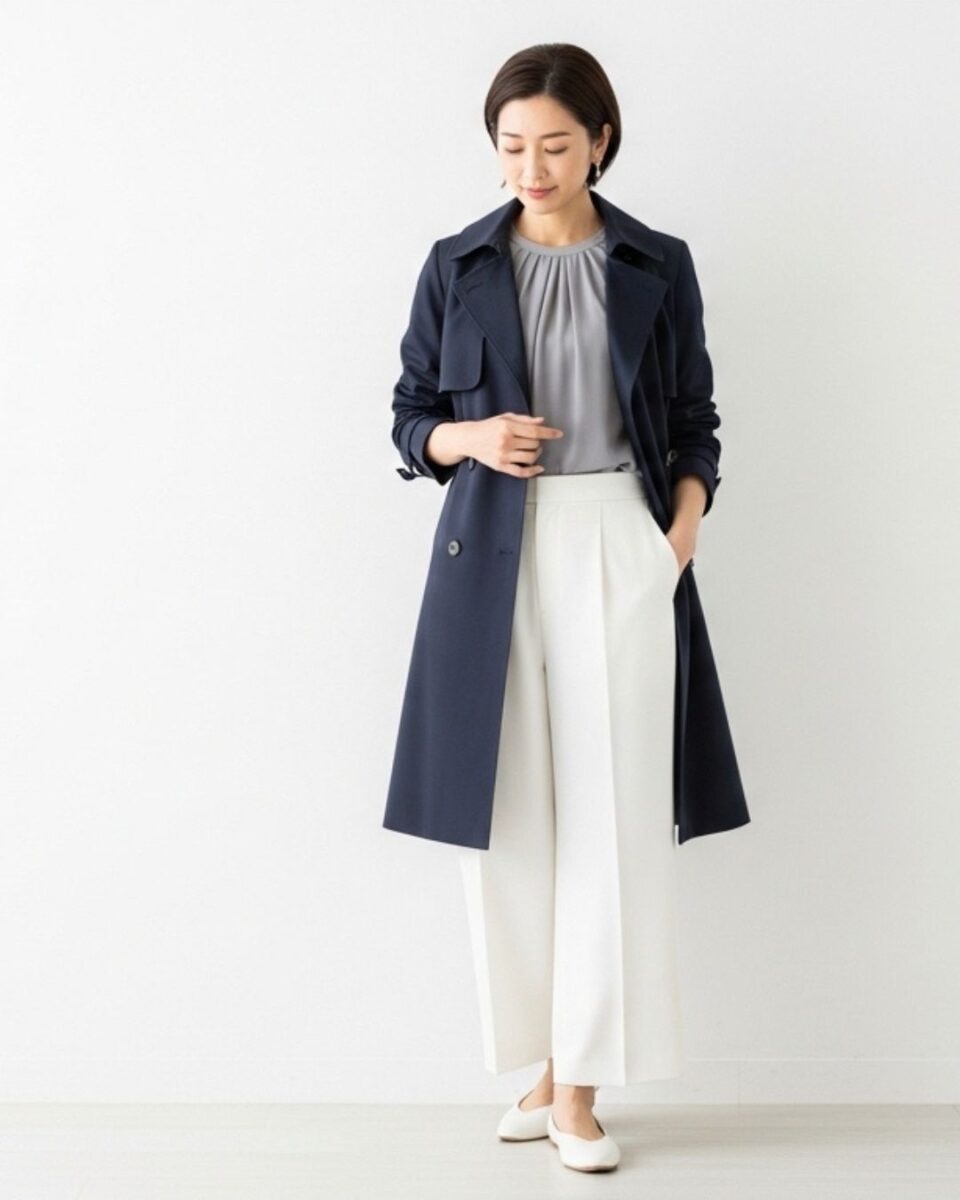 ネイビーのトレンチコートにベージュのパンツ、白シャツを合わせれば、フレンチシックな大人コーデが完成。