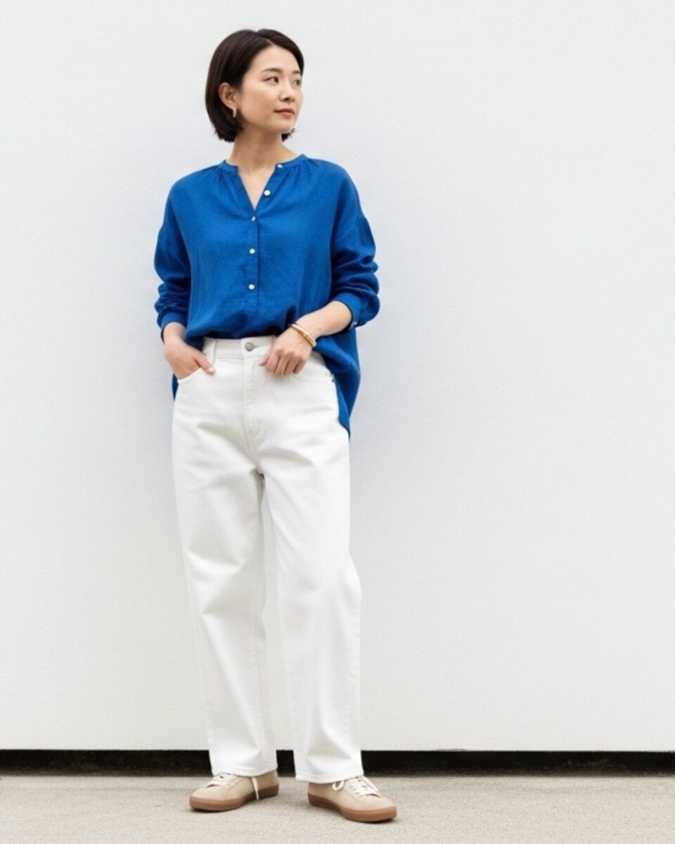 白のパンツやモノトーンのスカートと合わせることで、主役のブルーを活かした洗練コーデになります。