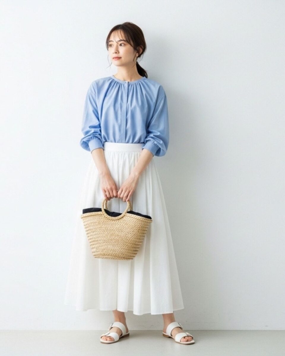 淡いブルーのブラウス×ホワイトスカートの組み合わせは、春夏の定番スタイル。