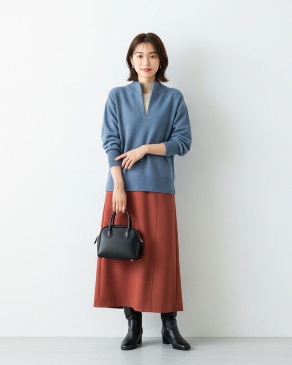 くすんだ青のプルオーバー×テラコッタのスカートは、秋のムードを感じさせる旬なコーデ。