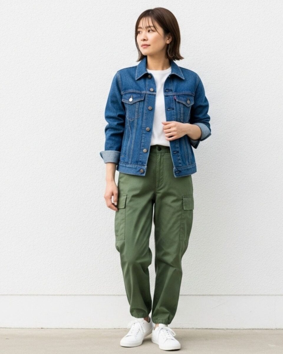 デニムのトップスなら、カーキパンツや白スカートと組み合わせると旬のカジュアルスタイルになります。