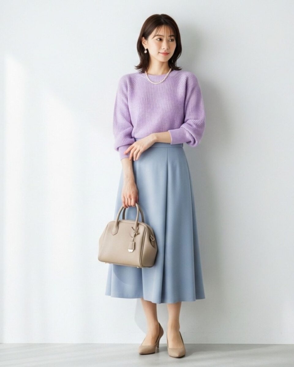 淡い青のスカートは、ラベンダーやピンクのトップスとトーンを揃えると甘めのコーデが完成します。