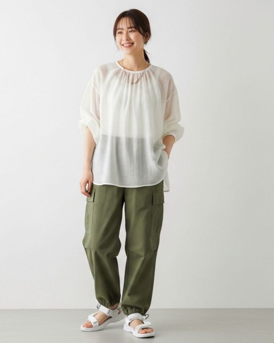 ふんわりブラウスにはすっきりパンツを合わせて、ギャザースカートにはコンパクトなトップスを合わせて…といった感じでメリハリのある着こなしを意識しましょう。
