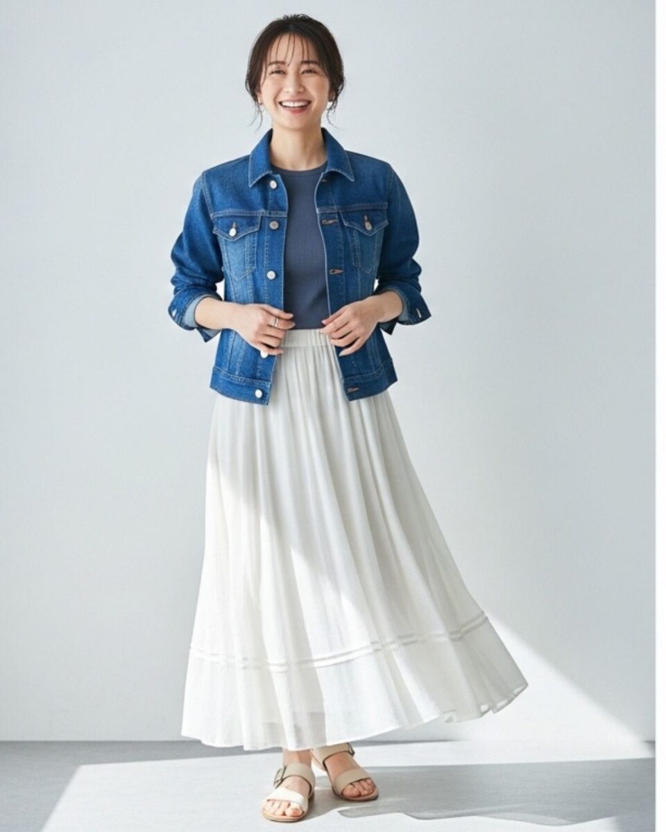 カーディガンやデニムジャケットなど、異素材との組み合わせもコーディネートのアクセントになります。