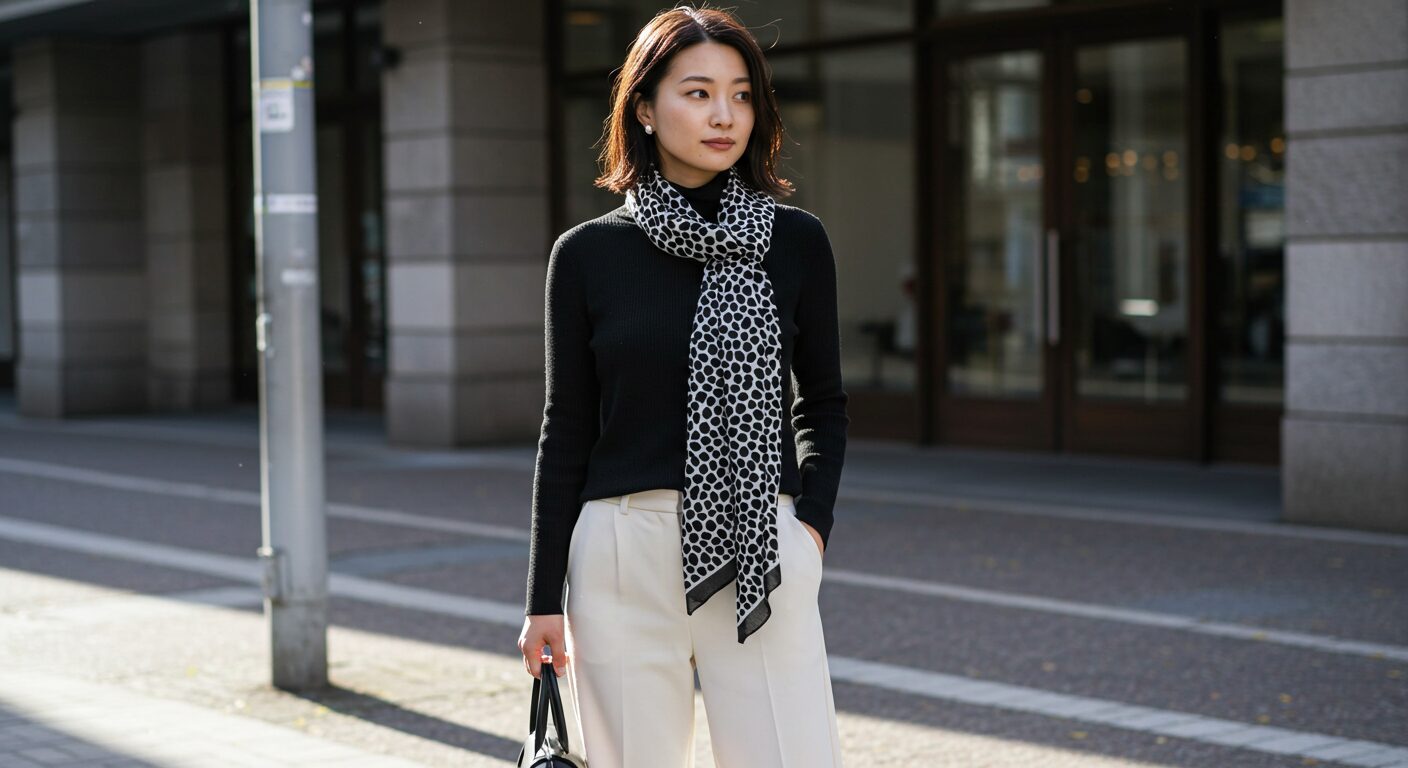 また、細長いスカーフを首に巻いて垂らすスタイルも、同様の視覚効果が期待できます。