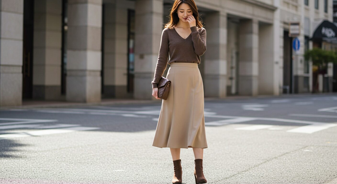 ハイゲージニットに合わせるなら、フレアスカートやAラインスカートがおすすめ。