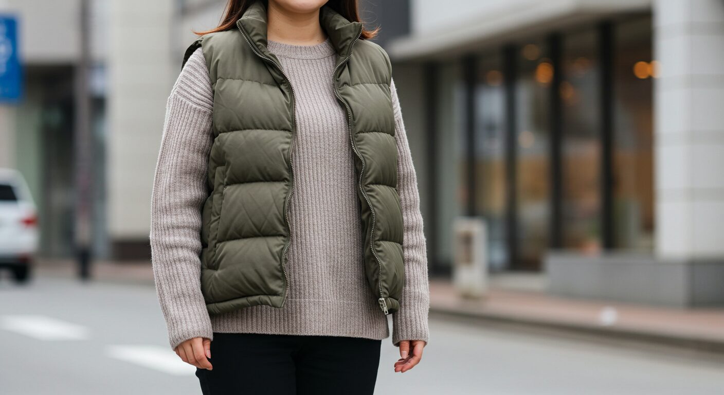 特に短丈のダウンベストは、腰位置を低く見せるため、スタイルダウンの原因に。