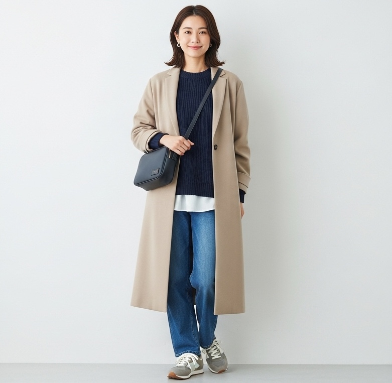 ベージュのロングコートに、ネイビーのニットとデニムパンツを合わせましょう。