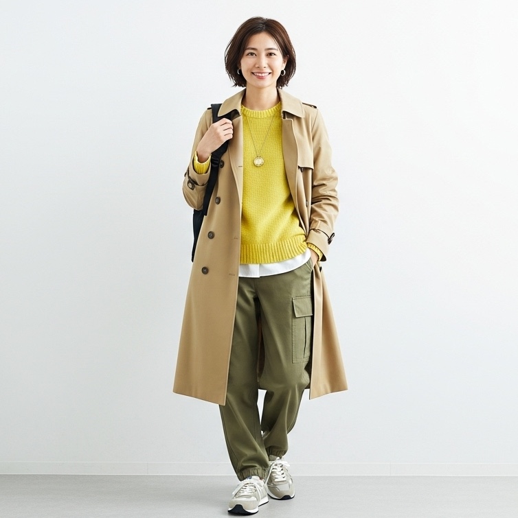ベージュのトレンチコートに、春色のニットとパンツを組み合わせましょう。