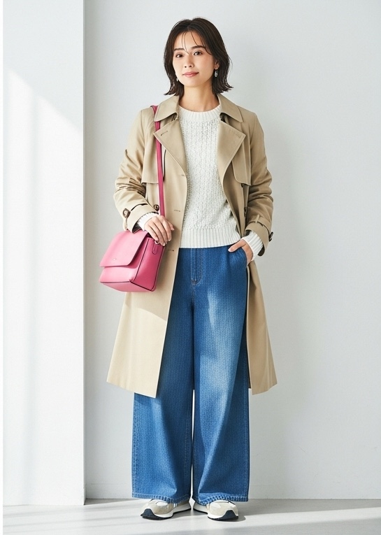 ボトムスはデニムやベージュのワイドパンツを合わせて、足元はショートブーツでまとめると、大人っぽい春コーデの完成。
