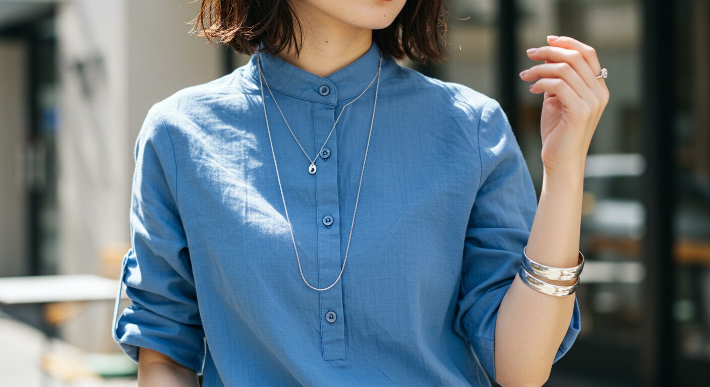 スタンドカラーシャツは首元がシンプルなので、アクセサリーが映えやすいアイテムです。