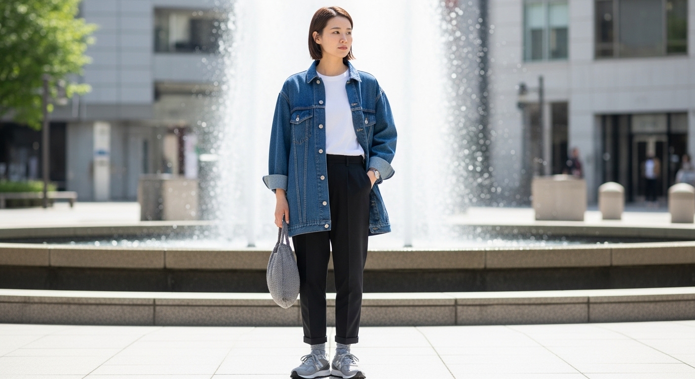 足元をスニーカーにすることで、通勤時の歩きやすさも確保できます。バッグはシンプルなトートバッグやレザーバッグを選ぶと、全体のバランスが良くなりますよ。