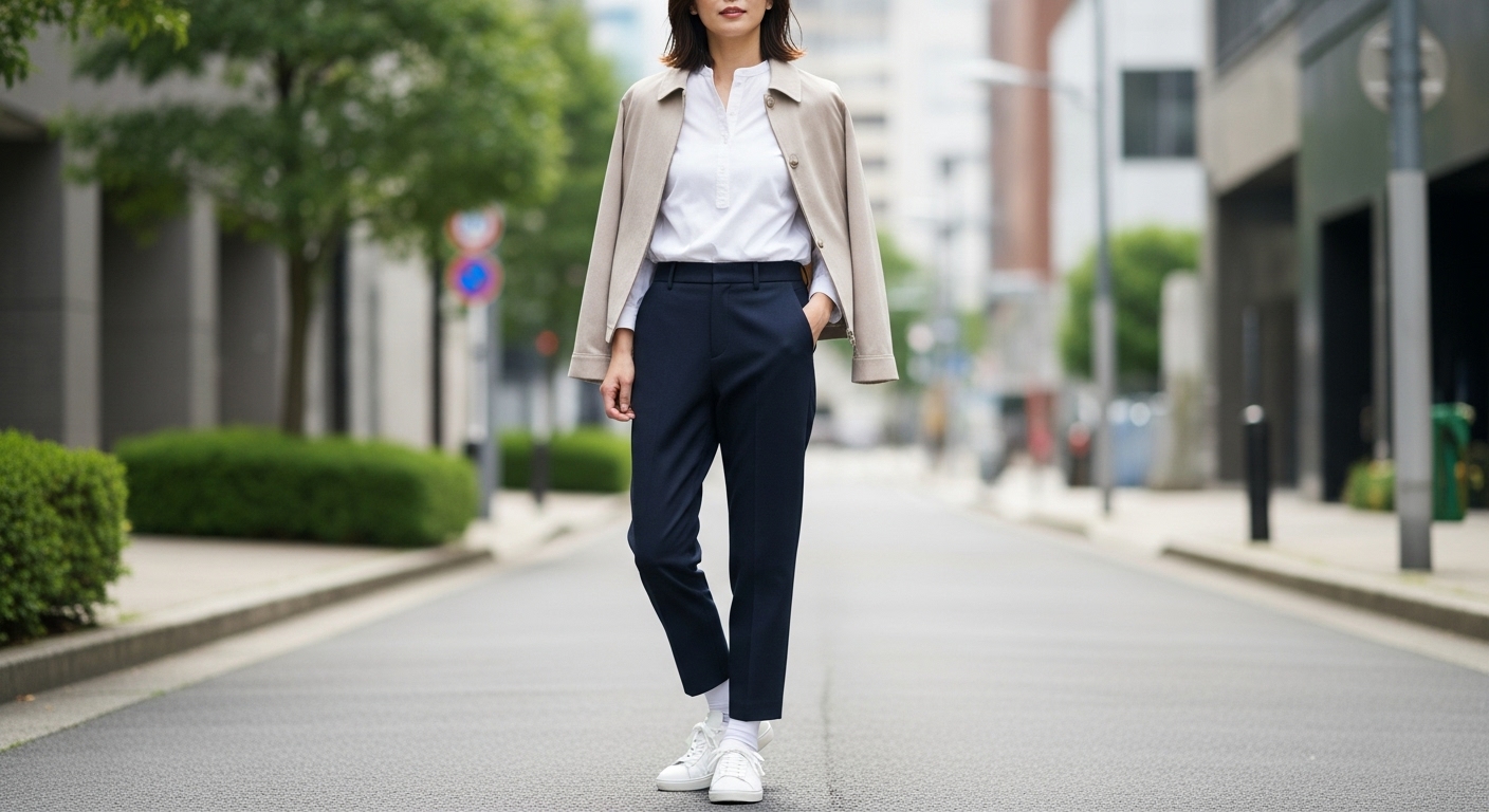 きちんと感のあるテーパードパンツに、カジュアルなスニーカーを合わせることで、程よい抜け感が生まれます。通勤コーデからお出かけスタイルまで幅広く使えて、大人の女性に人気の着こなしなんです。