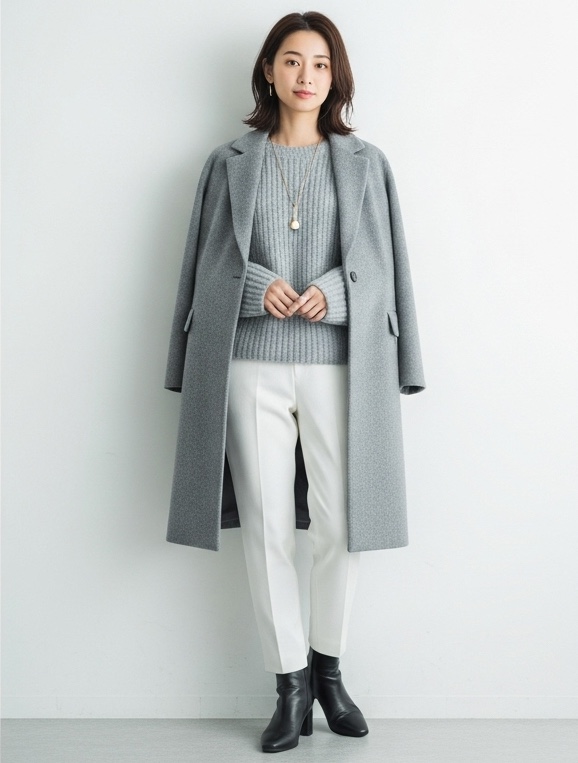 コートのインナーには、ニットやスウェットなど保温性に優れた素材のトップスを選びましょう。