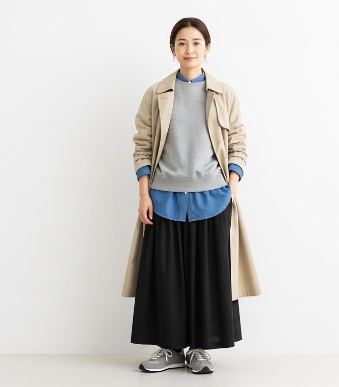 スプリングコートやトレンチコートなら、きれいめの装いにも合わせられます。