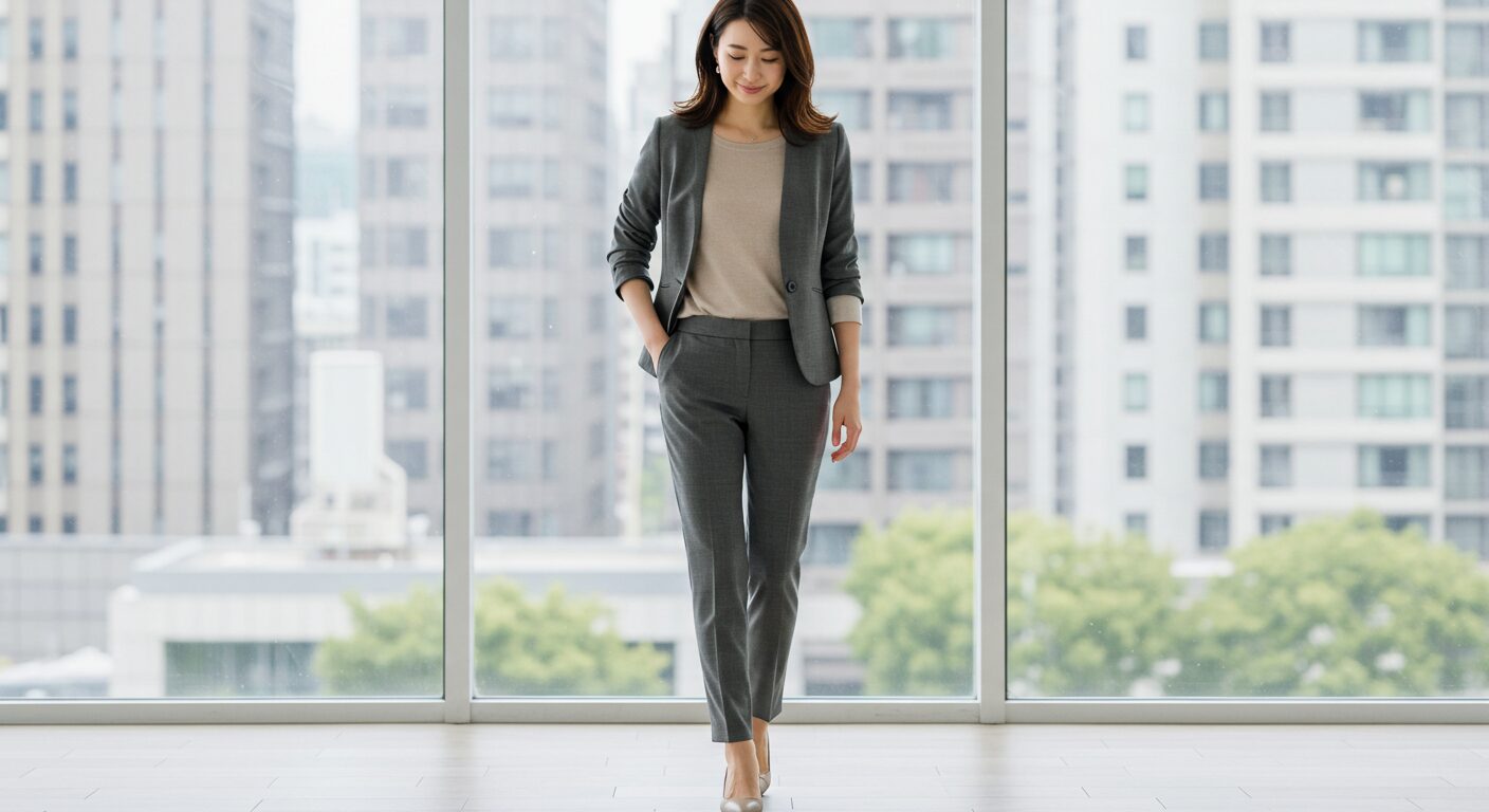 すっきりとした印象になり、オフィスやきれいめコーデに最適です。トレンド感を出したいなら、オーバーサイズがおすすめ。