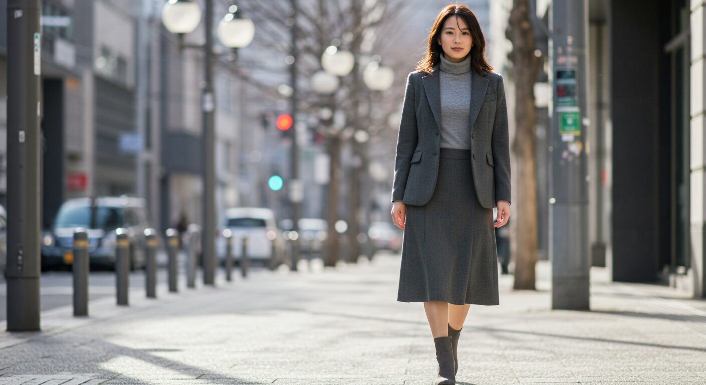 スラックスやタイトスカートを合わせれば、知的で洗練された印象になります。足元はショートブーツやパンプスですっきりと。